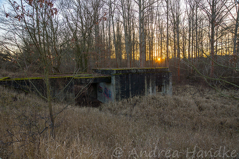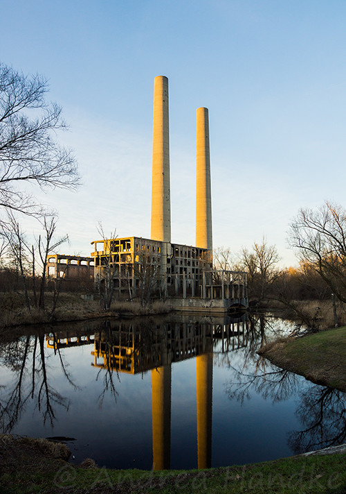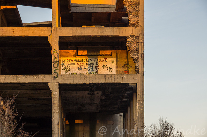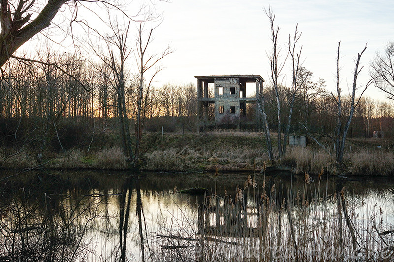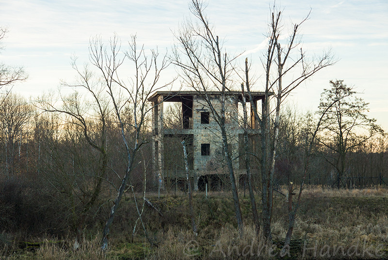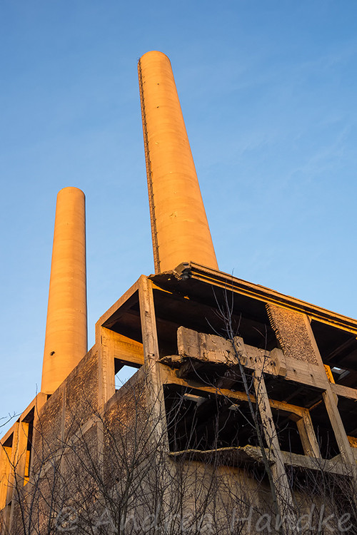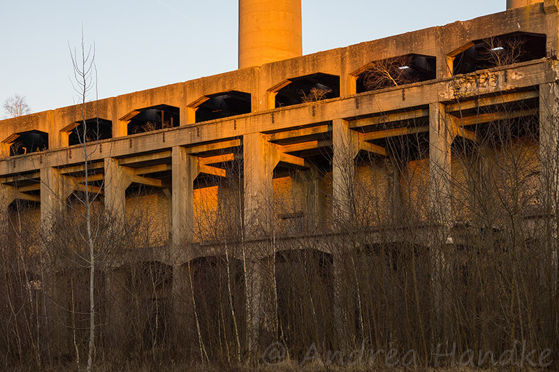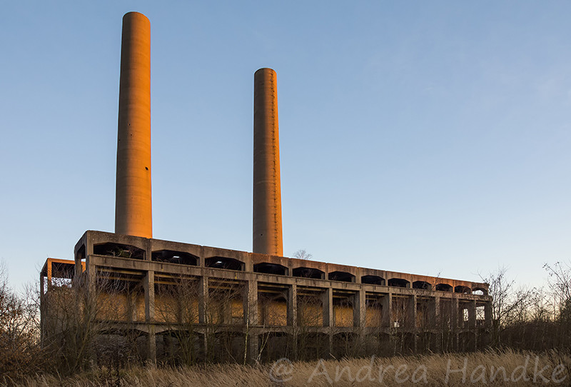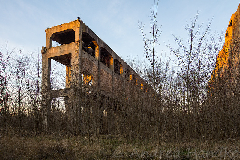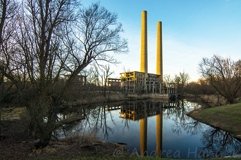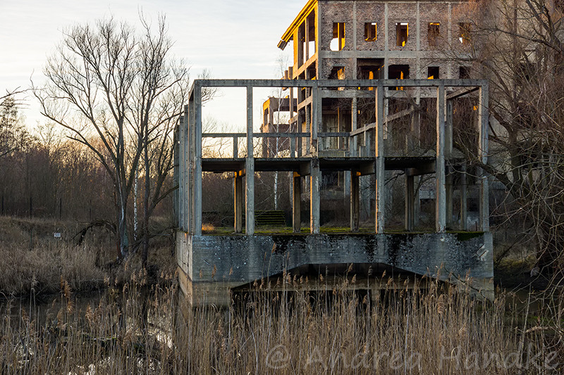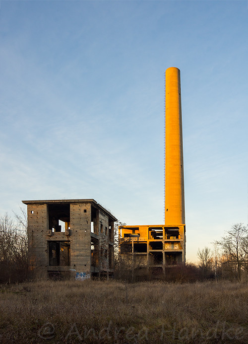Gleich hinter dem Oderdeich stehen heute noch Teile der Ruine eines nie in Betrieb gegangenen Braunkohlekraftwerkes.